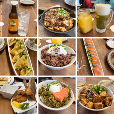 參觀完兩個景點後,雨繼續下,只好搭車返程,12點多回到安房,先到超市解決午餐,超市食物種類多,生魚片新鮮多樣,便當、輕食選項多,還有各式酒類,都很便宜。超市外走廊席地而坐,吃的津津有味,不夠再進去買,可比日式的吃到飽餐廳。酒足飯飽後,一群人隨性逛逛,前往海邊的一間溫馨咖啡Smiley享用下午茶,喝了咖啡及吃完美味蛋糕後,再漫步經過安房川大橋前往春牧一間酒廠-本坊酒造,試喝各式屋久島限定酒。附近盛久神社整修中,神社前有一棵夫妻樹頗奇特。Shiiba購物休息站是山友的補貨站,冰淇淋再次獲得我們的青睞,人手一隻,吃的甜滋笑容也甜蜜,此刻幸福無比。回到安房找尋晚餐餐廳,鎖定的餐廳未營業,附近餐館都很迷你,容納不下我們這麼多人,只好分批各自用餐。我們去這家餐廳kamogawa Restaurant,網路評價不錯,滿滿的生魚片套餐1800日圓,燒肉套餐+幾片生魚片1300日圓,果然CP值高。約莫八點餐畢,伴著綿綿細雨慢慢走回民宿。行程接近尾聲,內心有點意猶未盡~