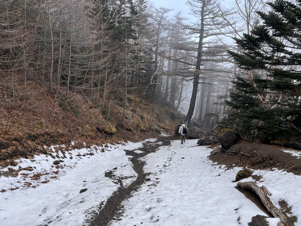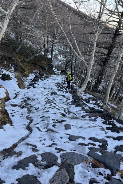 所有隊員集合完畢,朝著原先上山的路出發回程,也先請佐藤先生叫好馬返的計程車。一進入五合目以下的森林,沒有了風吹,體感溫度也上升了不少(雖然還是很冷啊)。孟佑教練告訴我們日本的計程車可是非常守時的,沒有在約定好的時間內出現,等個五分鐘就會走人了。我們隊伍的配速也很完美,設定兩個小時候抵達馬返,剛好一小時五十七分就到了!