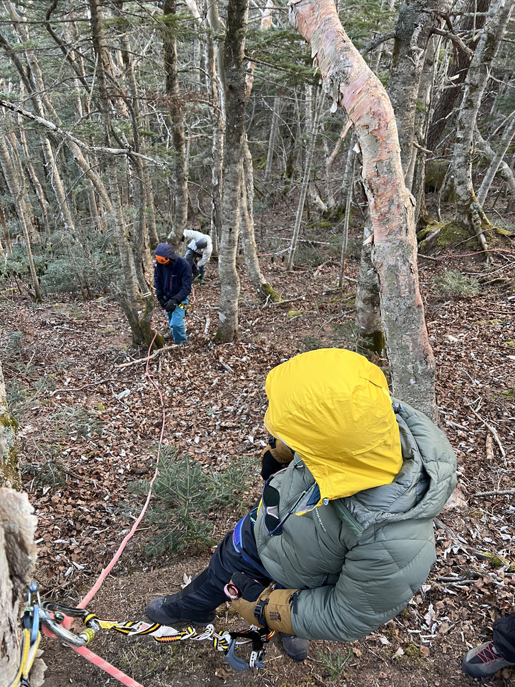 上六合目之後風開始變大了,原本就已經夠冷的日本冬天,加上風寒效應更是冷上加冷。剛好有一個雪坡很適合練習基本步伐,教練就帶著我們一起「學走路」了。沒錯,說是學走路一點都不為過,雪地的行進技巧和平時走路、登山都大不相同,更不用說是穿上冰爪後的腳感又截然不同,對應不同的環境、不同的坡面或坡度等,都有不同的步伐可以使用。「步伐是一切的基礎!」沒有錯,步伐學不好,還談什麼雪地攀登呢?
