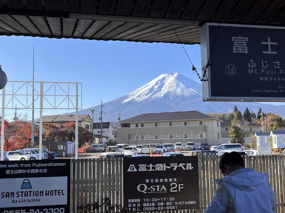 列車一路向西,在離開八王子市後,遠方冠雪的富士山便開始若隱若現,遊客也爭相將手機伸到窗邊拍照。在大月站後,列車轉向南行駛,在通過山谷地,抵達谷口的富士吉田市時,富士山也直接映入大家的眼簾。