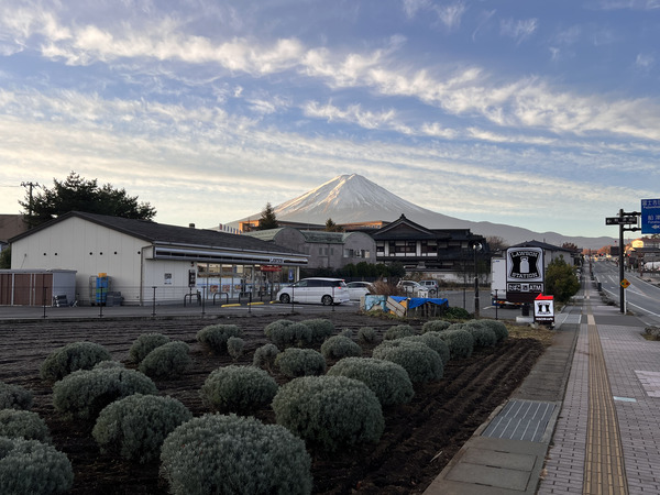 沒錯,就是騎上去!雖然今天的騎行辛苦,但總是有不一樣的收穫。沿途經過富士吉田街道上的金鳥居、找到在地的家庭烏龍麵店、上忍野時穿梭在美麗的針葉林公路、遠方能展望積雪的赤石山脈等,這都是無法被複製的美好回憶。也得益於當天晴空萬里的好天氣,富士山總是能在各種地方出現在我的視野中,成為穿梭富士五湖地區(註二)中最美麗的背景。