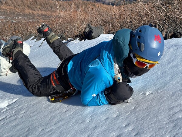 果然滑落制動不輕鬆,除了要克服滑落的恐懼外,更重要的是姿勢要正確,不然有非常大的可能會受傷。在雪坡上滑了足足一個上午,孟佑教練也一再強調滑落制動的「基本式」,不管是往前倒、往後倒、頭朝上還是頭朝下,滑落制動最後都會回到基本的姿勢。