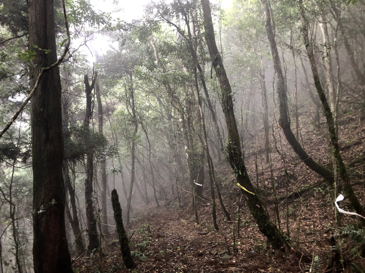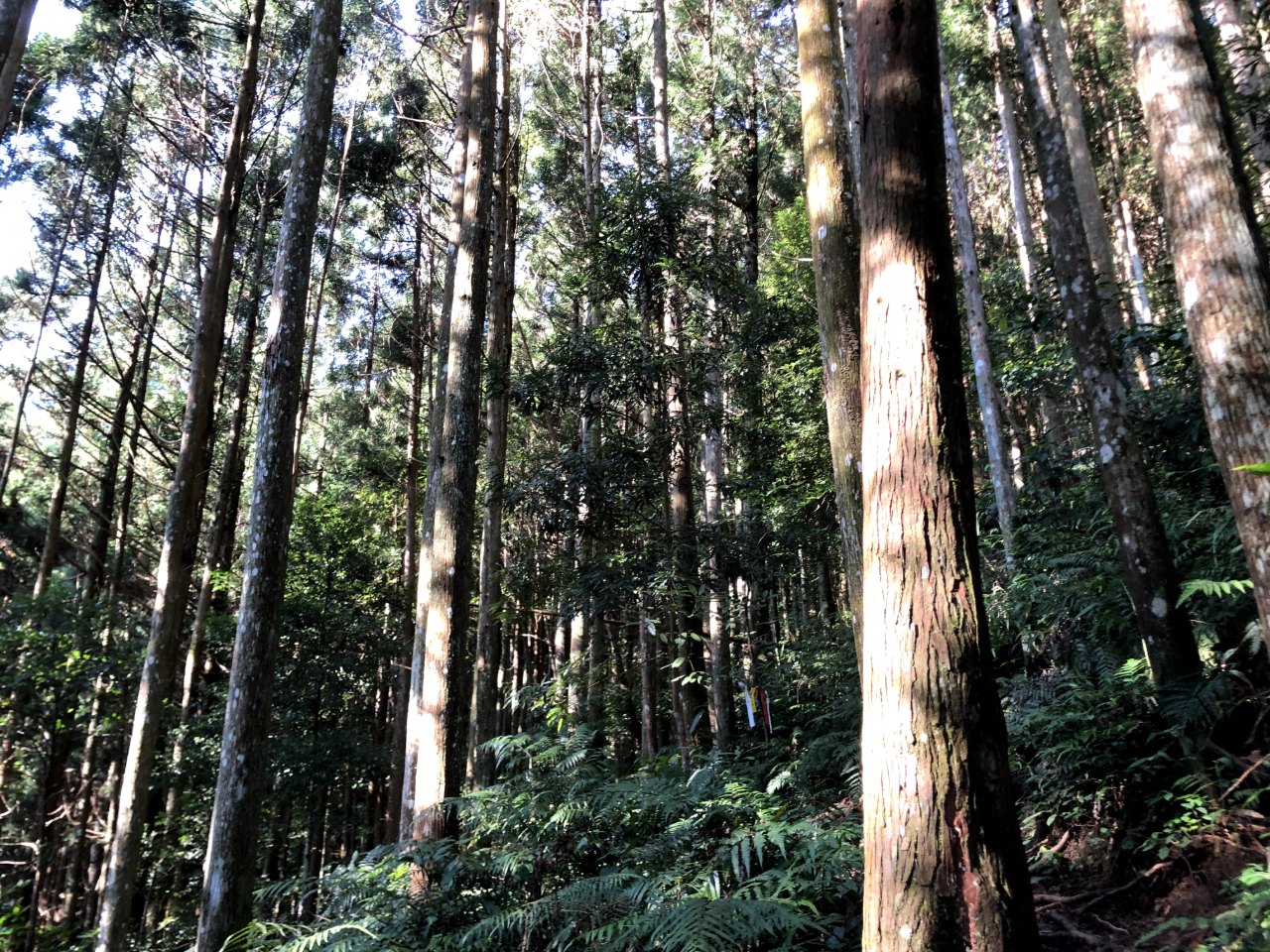 從登山口開始一路緩上,直至高台山,之後沿著平緩杉木林前進約1公里,再次進入上坡段,途中經過松針林、杜鵑林,最後抵達大島田山,山頂上豎立著一棵大紅檜。