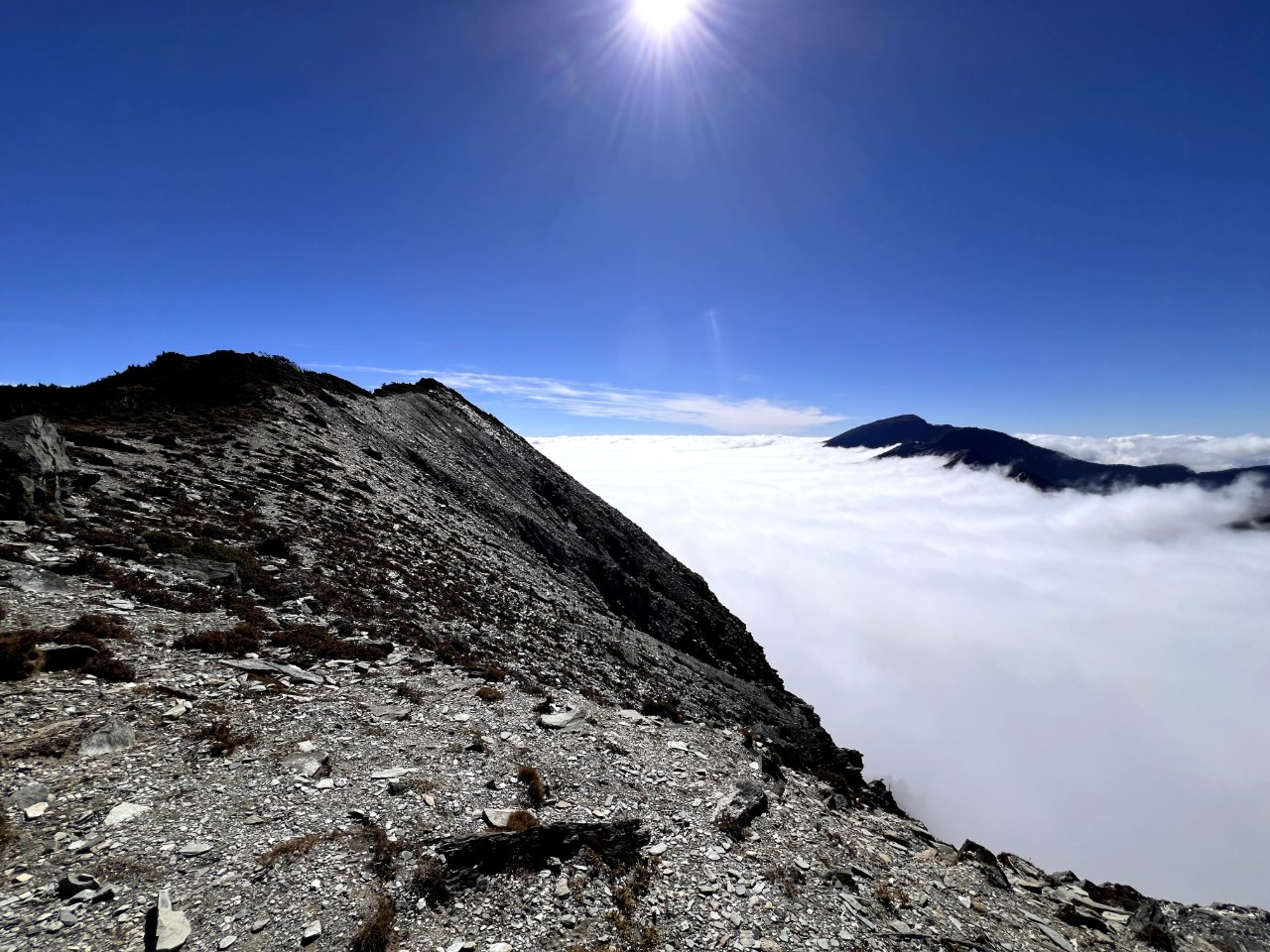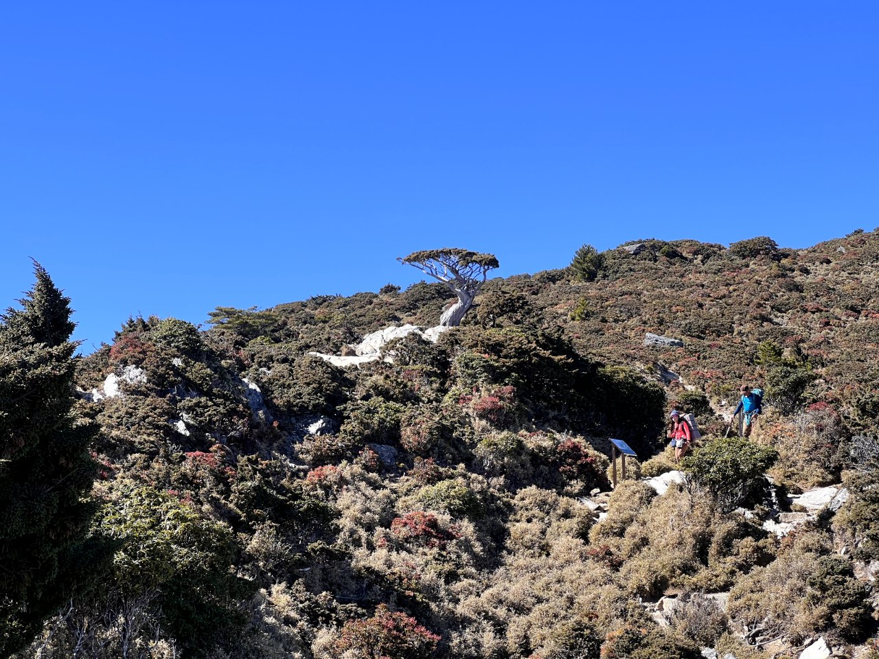 出森林上到稜線後,再往前走一小段就是著名的向陽名樹,樹形優美的玉山圓柏。繼續上坡,過向陽大崩壁後,又是一段陡上路段。約40~60分鐘到向陽山的岔路,向陽山僅1公里,爬升約100公尺,向陽山高3603公尺。回到向陽山登山口,接著緩坡向下,再經一段大石頭陡下後,就可看到嘉明湖山屋。
