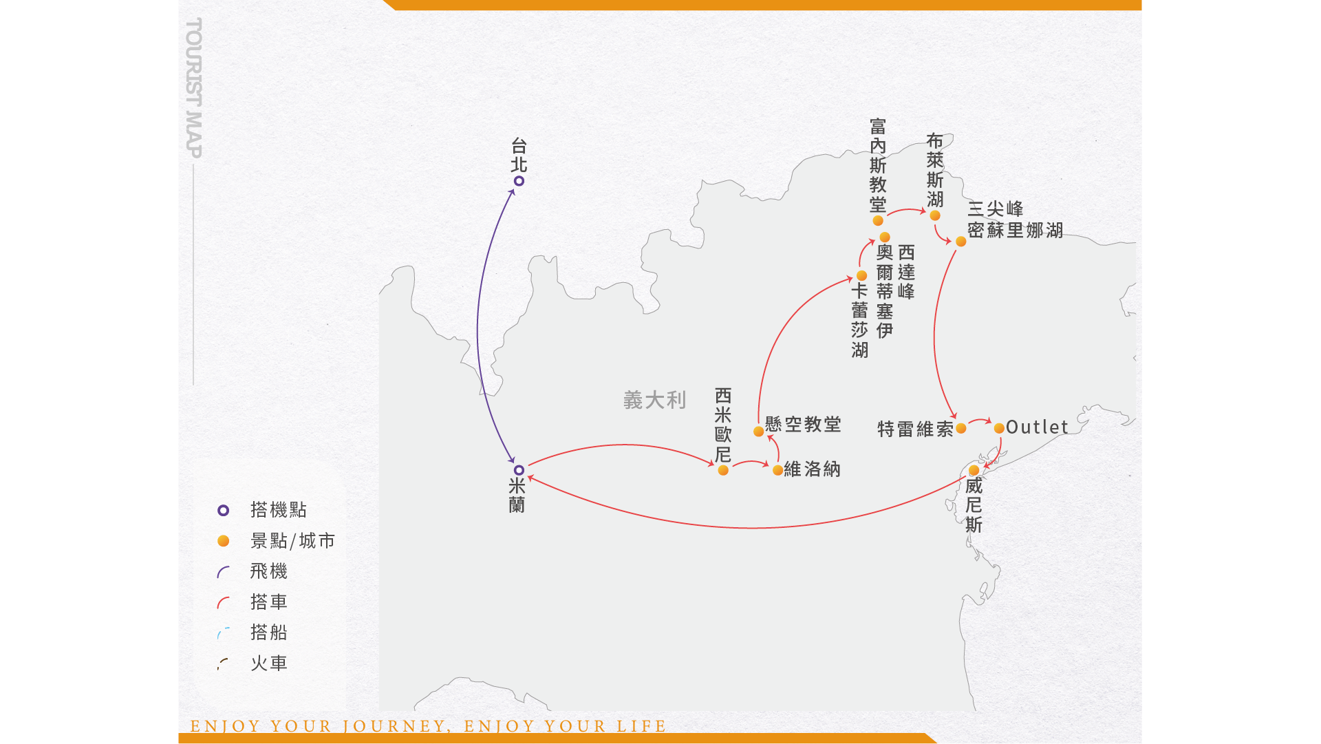 帶著浮雲遊子的浪漫心情,踏著輕快的腳步,行囊中裝滿無限的憧憬,搭乘豪華客機飛往歐洲民族及文化的搖籃-義大利。夜宿機上,翌日在空服員親切的問候聲中飛抵義大利名城-米蘭。