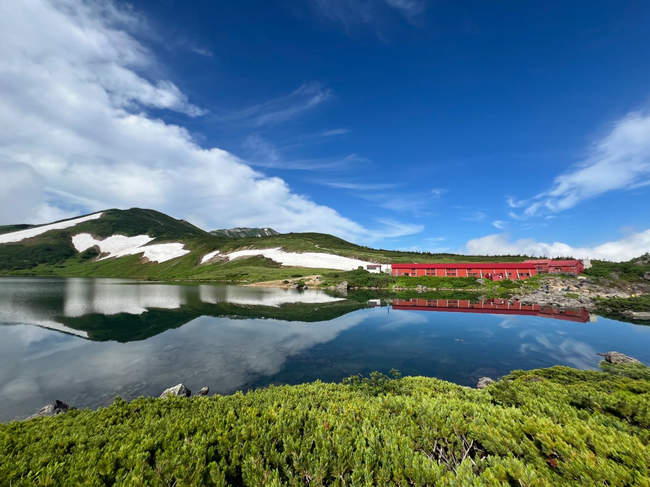 海拔高度 2379 公尺,約 50 至 80 萬年前火山噴發物堵住融雪所形成火山堰塞湖, 白馬大池面積是北阿爾卑斯第二大。翠綠的夏季可以發現野花點綴,湖旁也還有殘雪。