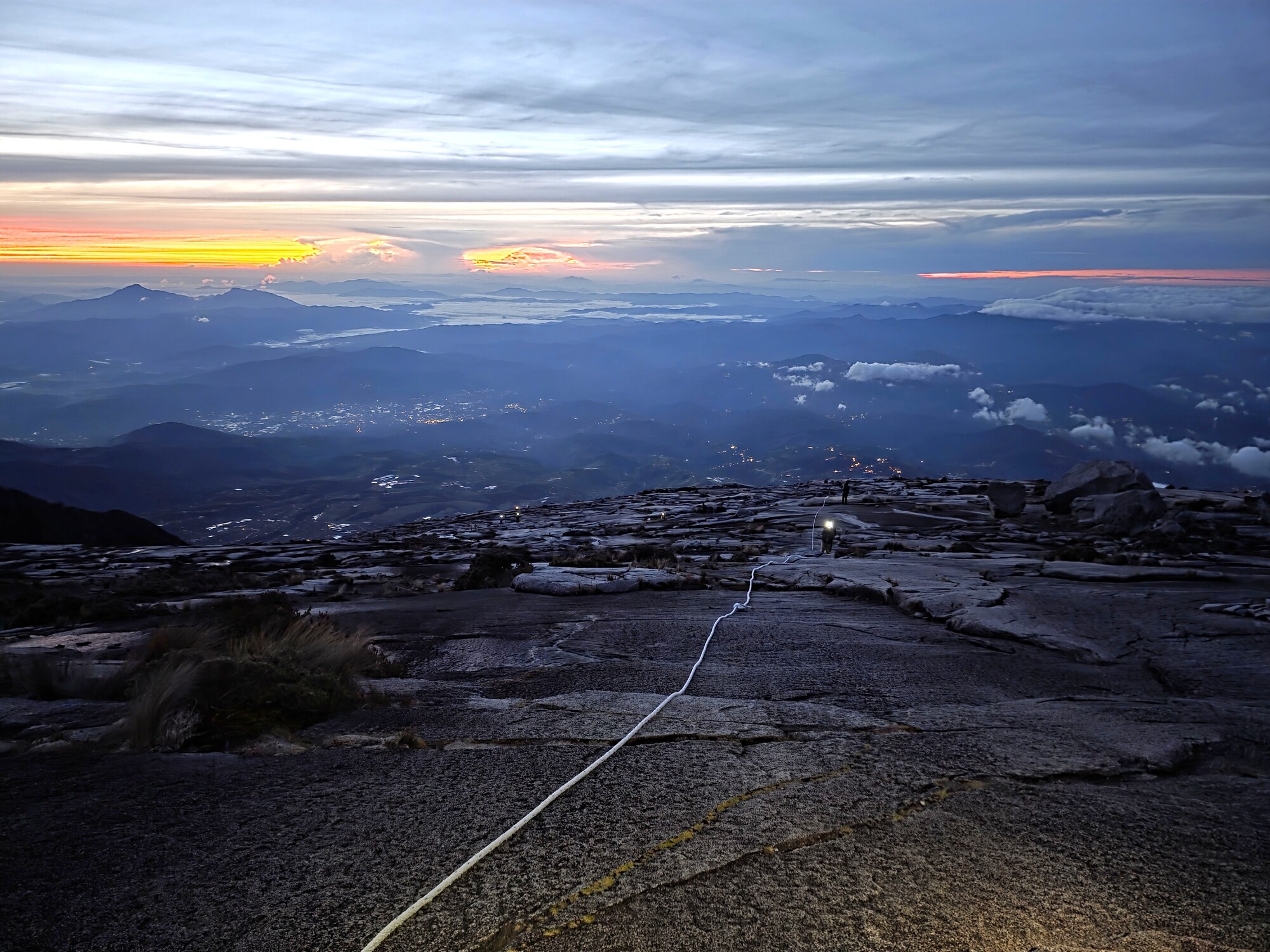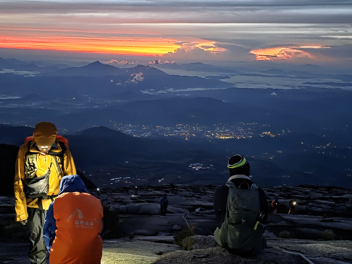 走在花崗岩大平台,看著山下城市的燈光在黑夜中閃爍,而遠方的天空即將迎接日出的到來,悄悄染出火紅色彩,也照亮群峰