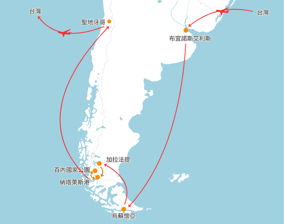 南美巴塔哥尼亞(Patagonia)高原,安地斯山脈以東的地區,橫跨智利與阿根廷兩國,主要位在阿根廷境內,小部分則屬於智利。這邊的地貌多樣且多元,冰河切割劇烈,山高谷深,山峰尖銳垂直,擁有全球最獨特的自然景觀之一,令全世界徒步健行者嚮往不已。我們先到阿根廷,參觀火地島國家公園、觀賞巨大的佩里托莫雷諾大冰川 Perito Moreno Glacier,再欣賞世界名山菲茨羅伊峰(Fitz Roy)與托雷峰(Cerro Torre)的雄姿。接著進入到智利百內國家公園,安排世界級的W Trek多日健行,探訪百內塔、法國谷、格雷冰川等奇景。這趟旅程絕對是您一輩子難以忘懷的。
