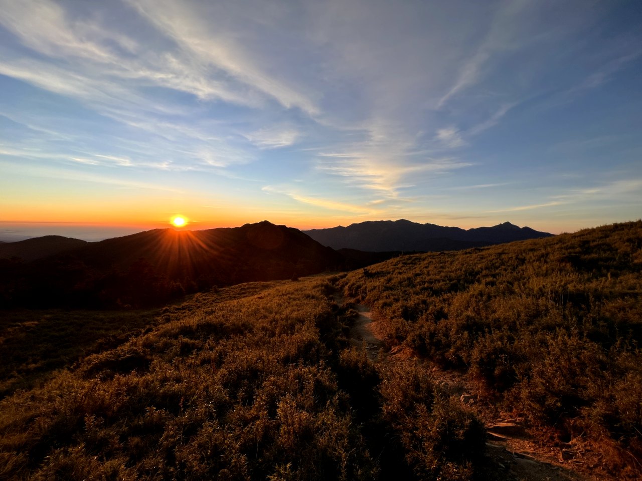 今天透早出發,清晨穿梭於新達山的草原,隨後抵達品田山前峰,小心翼翼地攀繩通過品田山V型斷崖,抵達四秀之首——品田山。這裡能非常清楚地望見大霸尖山與東霸五連峰,景色壯麗非凡。