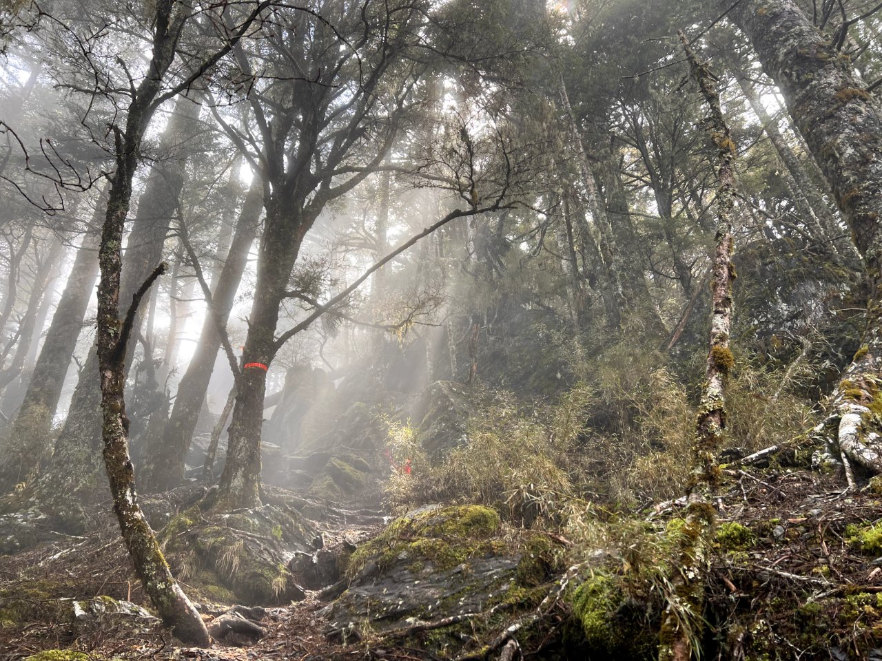 隨後原路返回,我們在三路路口沿著稜線森林前往桃山山屋/營地,這裡的地形較為複雜,須小心行進避免受傷。